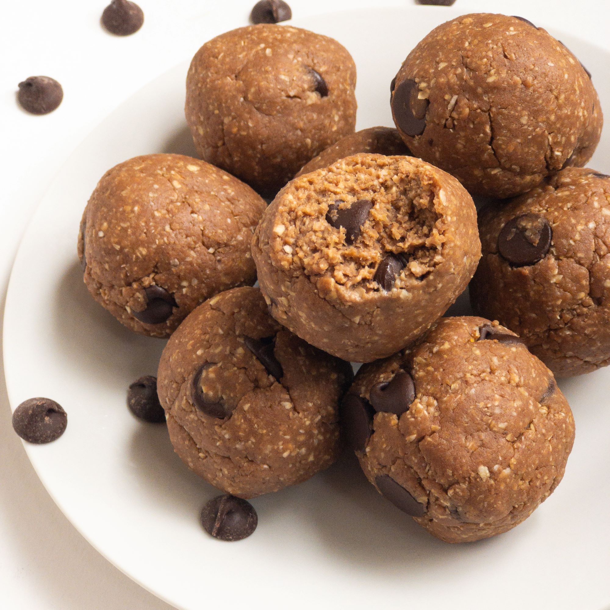 You will need oat flour, peanut butter or any nut butter of your choice, maple syrup or agave, chocolate protein power (I used one from Orgain), plant milk (I used unsweetened almond), vanilla extract, and vegan chocolate chips! If you prefer a milder flavor than peanut butter, I suggest subbing almond butter for the peanut butter as it is milder in taste. You could also sub out the chocolate chips for other add ins if you wanted to make different flavored energy balls! As long as you have the oat flour, liquid sweetener, a nut butter, and any plant based protein powder than you are good to go!
